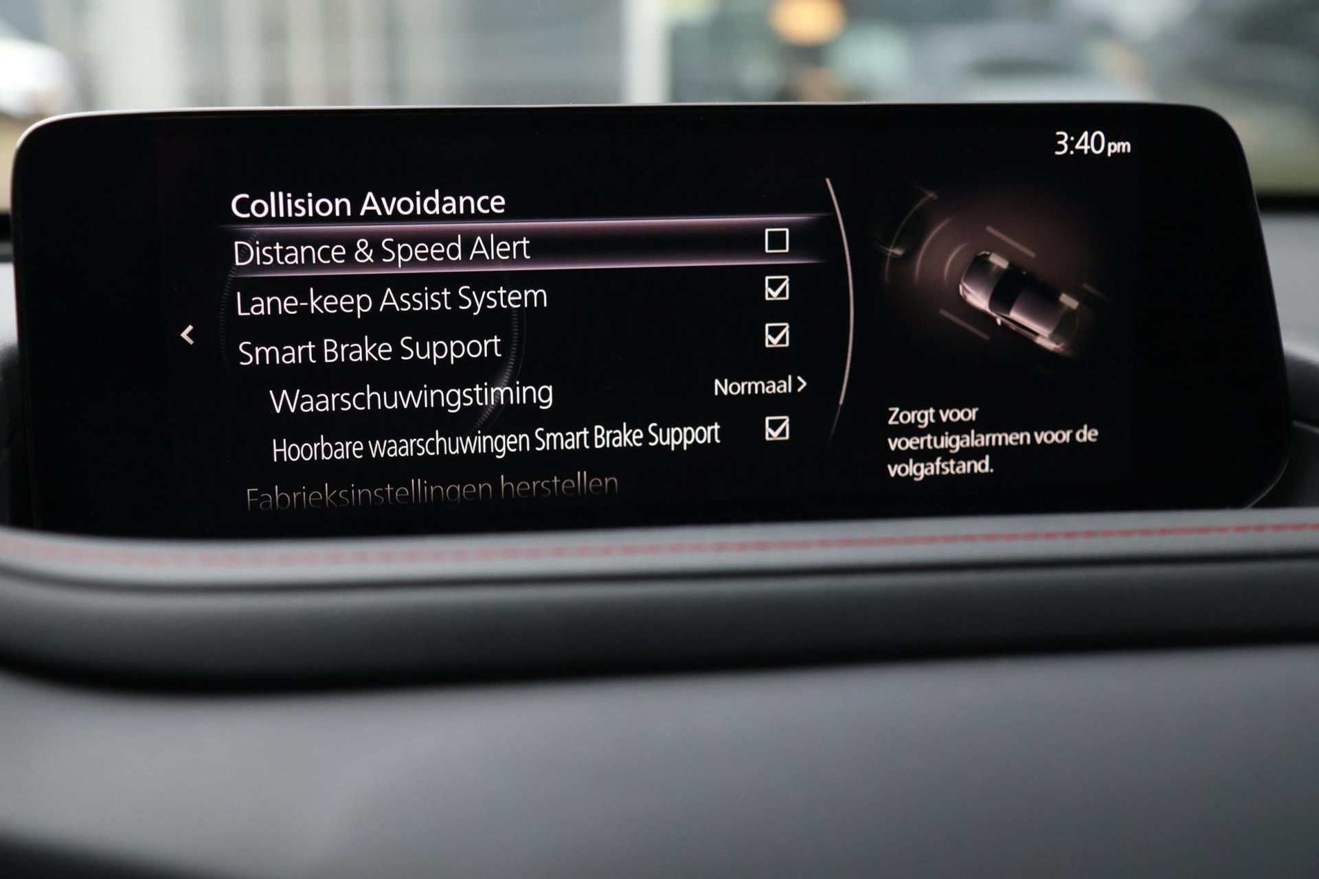 Het zal u verbazen hoe deze auto in staat is om voor u de omgeving en het verkeer om u heen in de gaten te houden. Uiteenlopende functies maakt de head-up display zichtbaar in de voorruit. In het instrumentarium kunt u bovendien de verkeersborden zien die u onderweg tegenkomt. Zo helpt deze Mazda u om veiliger te rijden. Onbedoeld buiten de rijstrook raken wordt voorkomen door het Lane-keeping systeem. Bovenop deze veiligheidsfeatures heeft deze Mazda bovendien dodehoekdetectie, accident avoidance system, forward collision warning system, hill hold functie, brake assist en vermoeidheidsherkenning.