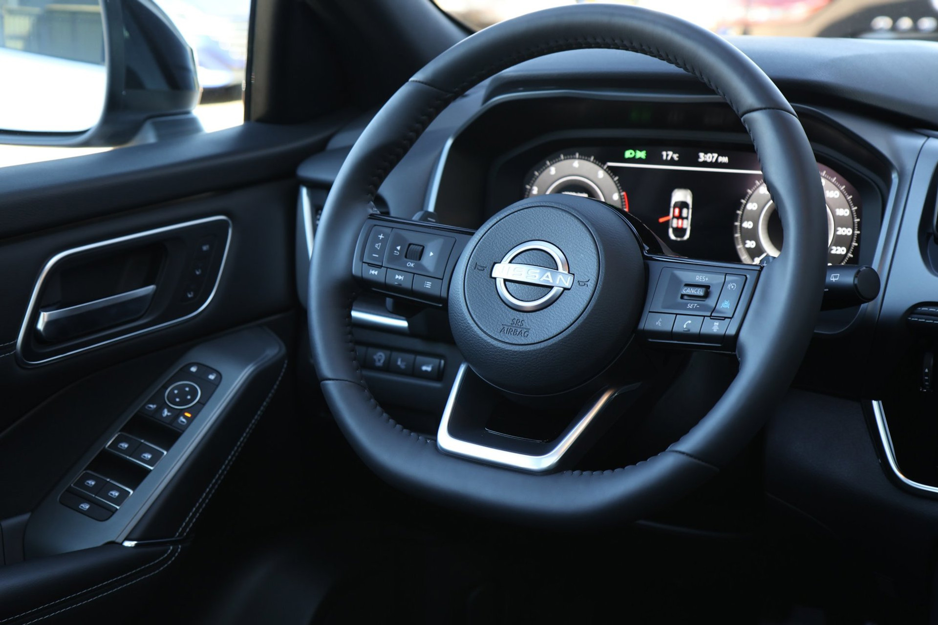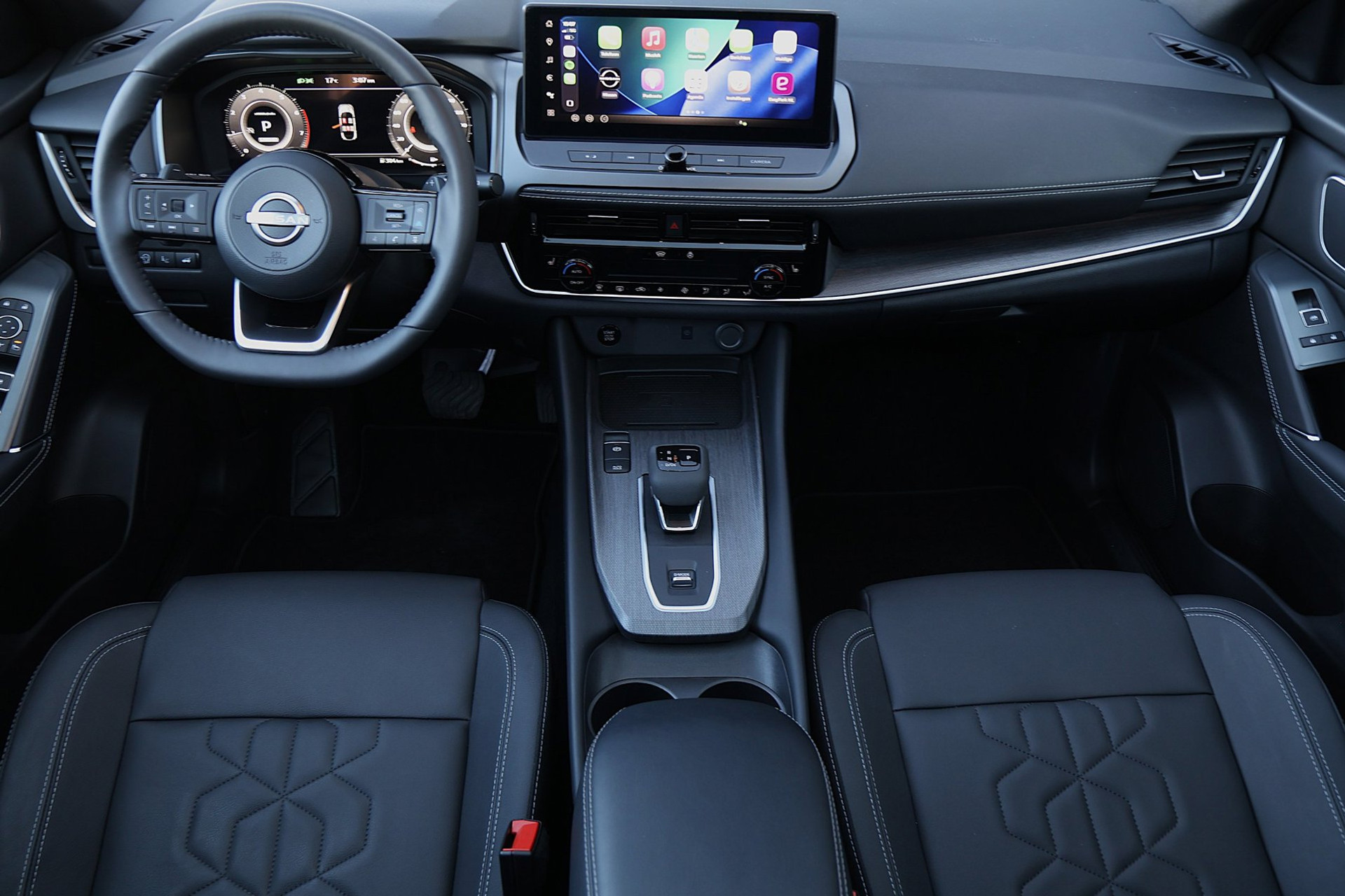 Wat ook opvalt, is de strakke en overzichtelijke informatie die het digitale dashboard levert. Door het combineren van beelden van vier camera's, biedt de 360 graden camera een naadloos en gedetailleerd beeld van de hele omgeving rondom deze auto. Adaptive cruise control is een comfortabele en veilige optie. Het systeem reguleert de snelheid en houdt automatisch afstand tot uw voorligger. De speciale app verbindt met Connected Services, die de status van vitale functies bijhoudt en waarschuwt als u bijvoorbeeld moet tanken, de bandenspanning moet controleren of olie moet bijvullen. De bediening van het audio-installatiesysteem en het navigatiesysteem gebeurt met knoppen op het stuur en als u wilt zelfs met uw stem. De audio is overigens voorzien van DAB-radio voor een altijd heldere ontvangst. Met achteropkomend verkeer waarschuwing, kruisend verkeer detectie, automatische airconditioning, draadloos opladen, regensensor en keyless entry is deze Nissan helemaal compleet.